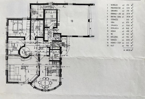 Hiša je sestavljena iz dveh nivojev (P + M), obsega 225 m2 celotne površine (vključno z garažo), od tega je 152 m2 bivalne površine.