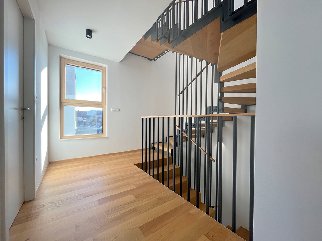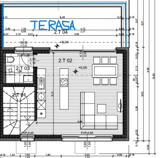 Stanovanje zajema pritlično etažo z vstopno predsobo, v nadstropju in terasni etaži so bivalne površine.